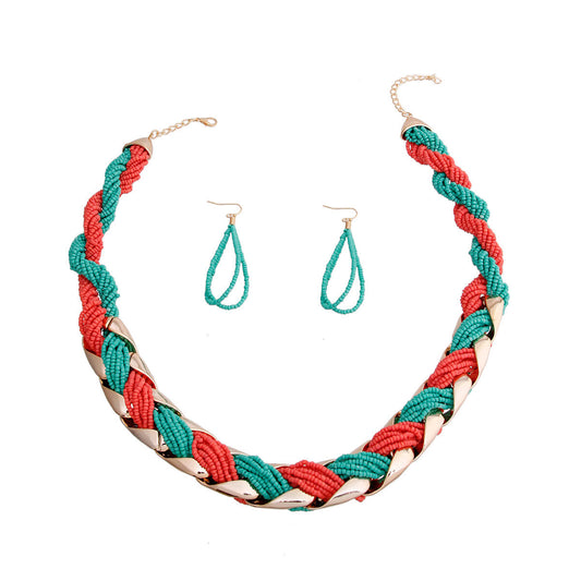 Turquoise and Coral Seed Bead Twisted Strands Collar Necklace Set Featuring Woven Gold Design. Necklace...