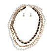 3 Layer Designer Inspired Necklace Set Featuring Black Fabric Woven Gold Metal Chain, Flat Gold Metal Oval Chain, and Pearl Strand. Necklace measures 16" to 22".