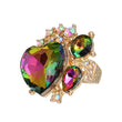 A Full Heart Textured Gold Metal Stretch Cocktail Ring Featuring Mixed Pink and Green Heart, Round and Teardrop Crystal and Rhinestone Detailing. Detail measures 1.65 inches.