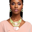 Alpha Kappa Alpha Sorority Paraphernalia Women's Collar Necklace Set. Hammered Gold Metal Bar Neckline with Triangular Marbled and Glittered Green Acrylic Resin Collar Necklace. Necklace Features Geometric Bib with Marbled Green Cut Out Oval, Marbled Pink Oval, and Marbled Pink Drop Detail. Collar Measures 1.15" at its Widest Point. Bib Center Measures 3.75" x 3.25". Lobster Clasp Closure. Includes Matching Fish Hook Oval Ring Drop Earrings.