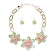 Alpha Kappa Alpha Sorority Paraphernalia Women's Collar Necklace Set. Marbled Pink and Green Acrylic Resin Oval Chain Link Necklace Featuring 3D Flower Collar. Flowers Feature Marbled and Glittered Pink and Green Acrylic Resin Petals Layered for Dramatic Effect. Gold Metal Petal Center. Each Flower Measures 2.65". Gold Metal Lobster Clasp Closure. Includes Matching Fish Hook Flower Drop Earrings.