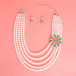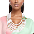 Women's Pearl Necklace Set Featuring Layered Graduated 5 Strands of White Acrylic Pearls with Elegant Round Silver Metal Rhinestone Leaves and AKA Alpha Kappa Alpha Detail. Lobster Clasp Closure. Includes Matching Double Pearl Drop Fish Hook Earrings. Necklace Sits approx 2.5" wide. Round Detail measures 2.25".