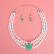 Women's Pearl Pendant Necklace Set. Graduated White Acrylic Pearl 3 Strand Necklace Featuring Silver Metal, Green Epoxy, and Pink Rhinestone Edge AKA Tea Rose Station Pendant. Silver Metal Lobster Clasp Closure. Includes Matching Double Pearl Drop Fish Hook Earrings. Pendant measures 1.5" x 1.8".