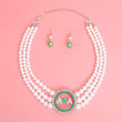 Women's Pearl Pendant Necklace Set. Graduated White Acrylic Pearl 3 Strand Necklace Featuring Silver Metal, Green Pearl Studs, and Pink Rhinestone Edge AKA Circle Station Pendant. Silver Metal Lobster Clasp Closure. Includes Matching Double Pearl Drop Fish Hook Earrings. Pendant measures 2".
