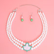 Women's Pearl Pendant Necklace Set. Graduated White Acrylic Pearl 3 Strand Necklace Featuring Silver Metal, Pink Epoxy, and Green Pearl Stud Edge AKA Tea Rose Station Pendant. Silver Metal Lobster Clasp Closure. Includes Matching Double Pearl Drop Fish Hook Earrings. Pendant measures 1.5" x 1.8".
