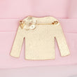 AKA Sorority Paraphernalia Women's Brooch Pin. Gold Metal Sweater Shaped Brooch with Pink and Green Epoxy Featuring Camellia Couture Flower, Infinity Rings, and Rhinestone Button Details. Safety Pin C Clasp Closure.