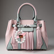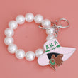 Sorority Inspired Keychain Handbag Charm Featuring Stretch White Pearl Wristlet Bracelet, Keyring, and Clip. Charm is Silver Metal with Pink and Green Epoxy Woman Wearing Wide Brim Hat Featuring Greek Lettering and Date. Charm measures 2.25" x 2.75".