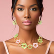 Alpha Kappa Alpha Sorority Paraphernalia Women's Collar Necklace Set. Gold Metal Oval Link Necklace Featuring Collar Comprised of Linked Pink and Green Marbled Acrylic Resin Flowers with Glitter Detail, Acrylic Rings, and Gold Metal Rings. Flowers measure 1.25" each. Rings measure 1". Lobster Clasp Closure. Includes Matching Fish Hook Flower Drop Earrings.