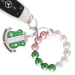 Silver Metal Keychain Handbag Charm Featuring Stretch Pink, Green, and White Pearl Wristlet Bracelet, Keyring, Clip, and Sorority Inspired Silver Metal Shield with Pink and Green Epoxy. Shield measures 2" x 2".