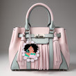 Sorority Inspired Keychain Handbag Charm Featuring Stretch White Pearl Wristlet Bracelet, Keyring, and Clip. Charm is Silver Metal with Pink and Green Epoxy Curly Haired Woman Wearing Off-Shoulder Top.
