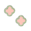 Alpha Kappa Alpha Sorority Paraphernalia Women's Stud Earrings. Silver Metal with Pink Epoxy Clover Shaped Studs Featuring Green Rhinestone Trim Detailing. Post Backing.