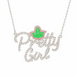 Alpha Kappa Alpha Sorority Paraphernalia Women's Silver Metal Chain Necklace Featuring Pretty Girl Station Pendant with Clear Rhinestone Detailing and Pink Green AKA Ivy Leaf. Pendant measures 2" x 2.5". Lobster Clasp Closure.