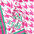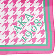 Alpha Kappa Alpha Sorority Paraphernalia Women's Scarf. Large Pink, Green, and White Silky Square Scarf Featuring Houndstooth Print Design with Pink and Green Stripe Edging, AKA Greek Letters in 2 Corners and AKA Shield in the opposite corners. Silky 100% Polyester.