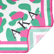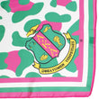 Alpha Kappa Alpha Sorority Paraphernalia Women's Scarf. Large Pink, Green, and White Silky Square Scarf Featuring Leopard Print Design with Green and Pink Stripe Edging, AKA Letters in 2 Corners and AKA Shield in the opposite corners. Silky 100% Polyester.