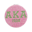 Alpha Kappa Alpha Sorority Paraphernalia AKA Pink and Green Rhinestone, Pink Faux Leather Coating, and Silver Metal Compact Mirror. Hinge Opening. Cosmetic Mirror Interior with Regular Plane Mirror and Magnified Mirror. Anti-Fog Glass.