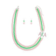 Alpha Kappa Alpha Sorority Paraphernalia Women's Pearl Necklace Set. Long Pink and Green Acrylic Pearl Necklace Featuring 3 Rows with AKA Pearl Studded Letter Detail. Silver Metal Lobster Clasp Closure. AKA Detail measures 2.2". Includes Matching Fish Hook Double Pearl Drop Earrings.