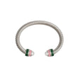 Alpha Kappa Alpha Sorority Paraphernalia Women's Cable Bangle. Thick Silver Metal Twisted Cable Classic Wrap Bangle Bracelet Featuring Epoxy Pink and Green Stripes with Acrylic Pearl End Cap Detailing. End Cap measure .5" wide.