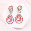 AKA Sorority Paraphernalia Women's Clip On Earrings. Silver Metal Double Teardrop Clip On Earrings Featuring Teardrop Shaped Pink Crystals Surrounded by Green Rhinestone Halo and Pink Rhinestone Detailing. Paddle Back Clip On Closure.