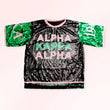 Alpha Kappa Alpha Sorority Paraphernalia Black Sequin Jersey Shirt Featuring Pink and Green Alpha Kappa Alpha with Green Sleeves. One Sleeve has AKA Letters and Other has 1908. Pink Collar Trim and Pink Green Stripe Detailing. Black Interior Lining. 100% Polyester. One Size. Shirt measures 30" from shoulder to bottom hem. 25" wide when laid flat. 12" Sleeve length. Washing Instructions: Turn jersey inside out. Hand wash in cold water with a mild detergent. Hang Dry.