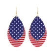 Gold Metal Fish Hook Earrings Featuring American Flag Printed Vegan Leather Teardrop Layers. Earrings measure 1.5 inches wide.