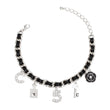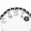 Women's Anklet. Silver Metal Ankle Chain Woven with Black Vegan Leather Featuring 5 Dangling Charms Including: Rhinestone C and Perfume Bottle, Pearl Studded No 5, Key, and White Camellia Flower Charm. No 5 Charm measures .65". Lobster Clasp Closure.