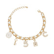 Women's Anklet. Gold Metal Ankle Chain Woven with White Vegan Leather Featuring 5 Dangling Charms Including: Rhinestone C and Perfume Bottle, Pearl Studded No 5, Key, and Black Camellia Flower Charm. No 5 Charm measures .65". Lobster Clasp Closure.