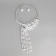 Women's Asymmetric Necklace Set. Silver Metal Curb Chain with 8 Strand White Acrylic Pearls and Rhinestones Asymmetric Knot Design Necklace with Pearl and Rhinestone Fringe Tassel Drop. Drop measures 7 inches long. Unique Elegant Design. Lobster Clasp Closure. Includes Matching Pearl Post Backing Stud Earrings.
