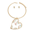 Gold Metal Rigid Collar Necklace Set Featuring Cut Out Angled Heart with Multi Style Aurora Borealis Crystal Rhinestone Detailing. Pendant measures 4 inches long and 3.5 inches wide.