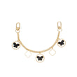 Women's Handbag Chain. Gold Metal Bag Chain Featuring Round Charms with Black Epoxy Butterflies and Cut Out Quatrefoil Clover Charms. Clip Closure. Butterfly Charms measure 1".