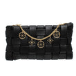 Women's Handbag Chain. Gold Metal Bag Chain Featuring Round Charms with Black Epoxy Monogram Flowers and Cut Out Flower Charms. Clip Closure. Round Charms measure 1".