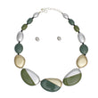 Women's Beaded Necklace Set. Graduated Acrylic Stone-Like Earthy Shades of Green Beaded Necklace Featuring Matte Gold and Matte Silver Painted Diagonal Detailing. Black Acrylic Seed Bead and Silver Ball Bead Spacers. Center Beads Measure 2.25" Each. Silver Metal Lobster Clasp Closure. Includes Matching Ball Stud Post Backing Earrings.
