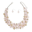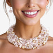 Women's Bib Choker Necklace Set. Artistic Pale Pink and Gold Acrylic and Glass Bead Bib Choker Necklace Woven with Silver Finish Copper Wire. Bib Features Graduated Design and Measures 2" Wide at Center. Silver Metal Lobster Clasp Closure. Includes Matching Bead Fish Hook Earrings. This collar's bib structure highlights the neckline, making it ideal for those who appreciate bold, trend-setting styles. The careful blend of color, texture, and craftsmanship delivers a stunning mix of modern edge and elegance.
