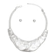 Women's Bib Necklace Set. Edgy and Industrial Triple Strand Silver Metal Mesh Chain Necklace Featuring Rigid Heavy and Thick Sliding Metal Plates Bib with Scratched Texturing. Center Plate Measures 2" x 5". Lobster Clasp Closure. Includes Matching Domed Stud Post Backing Earrings.
