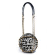 Black and White Graffiti Print Vegan Leather Basketball Shaped Handbag Featuring Basket Chain Shoulder Strap. Main Zipper Closure. Detachable Gold Metal Shoulder Chain Included