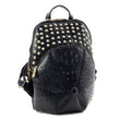 Black Ostrich Vegan Leather Baseball Hat Shaped Backpack Bag Featuring Stud Detailing. Main Zipper Closure. Front Zipper Pocket. Interior has Zipper Pocket. Adjustable Shoulder Straps