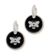 Silver Metal Twisted Hoop Earrings Featuring Designer Inspired Round Black Epoxy Charm with Rhinestone Bee Detail. Charm measures 1.15 inches.