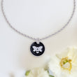Silver Metal Twisted Rope Chain Necklace Featuring Designer Inspired Round Black Epoxy Pendant with Rhinestone Bee Detail. Pendant measures 1.15 inches.