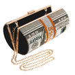 Black Bling Rhinestone Rolled Money Cylinder Crossbody Clutch Bag Featuring $10K Banded Benjamins Cash Detailing. Kiss Lock Hinge Closure. Lined Interior. Detachable Gold Metal Shoulder Chain Included