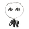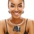 Burnished Silver Metal Rigid Collar Necklace Set Featuring Black Epoxy Metal Elephant Pendant with Rhinestone Details. Pendant measures 2.25 inches long and 2.75 inches wide