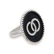 Silver Metal Stretch Ring Featuring Designer Inspired Round Black Epoxy Detail with Clear Rhinestone Infinity Rings. Detail measures 1.15 inches.