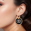 Gold Metal Twisted Hoop Earrings Featuring Designer Inspired Round Black Epoxy Charm with Clear Rhinestone Infinity Rings Detail. Charm measures 1.15 inches.