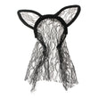 Black Headband Featuring Pleated Lace Trim, Bunny Ears, and Veil. Veil measure 10 inches long. Ears measure 4 inches long and 2.5 inches long