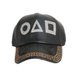 Black Vegan Leather Baseball Cap Featuring Gold and Black Designer Inspired Greek Key Rhinstone Visor and Popular TV Show Game Stone Details. Adjustable Velcro Strap