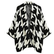Women's Knit Cardigan. Black and White Large Print Houndstooth Knit Cardigan Featuring Folded Collar, Wide Sleeves, and Open Front Design. Ultra Soft Knit Sweater Material. 100% Acrylic. Machine Wash Cold. Tumble Dry Low.