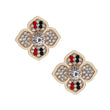 Gold Metal with Red and Green Striped Rhinestone Luxury French Designer Inspired Flower Stud Earrings.