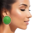 Women's Stud Earrings Large Round Gold Metal Studs Featuring Domed Green Wood Detail. Studs measure 1" tall. Post Backing.