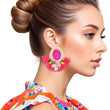 Women's Stud Earrings Elegant Gold Metal with Oval Fuchsia Crystal and Pave Rhinestone Halo Studs Featuring Fuchsia Silk Fan Tassel, Gold Metal Filigree, Multi Color Rhinestones, and 3D Acrylic Floral Detailing. Post Backing.