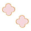 Women's Stud Earrings. Gold Metal Quatrefoil Clover Shaped Earrings Featuring Pink Acrylic Resin Detailing. Post Backing.