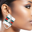 Women's Stud Earrings. Large Silver Metal Handbag Shaped Stud Earrings Featuring Draped Chain, Bee, and Red Green Stripe Detailing. Post Backing.