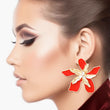 Women's Stud Earrings Textured Gold Metal with Red Epoxy Tropical Iris Flower Earrings Featuring Rhinestone Centers. Post Backing.